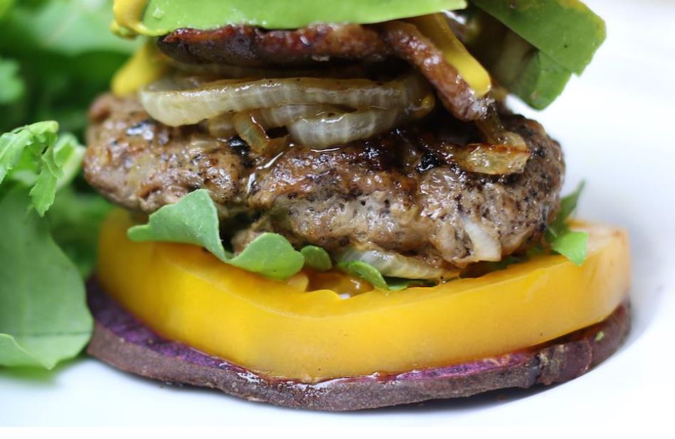 - Top med sennep, hot sauce, sauteret løg, avocadoskiver og bacon. (et stegt æg går også godt med disse burger eller andre toppings.