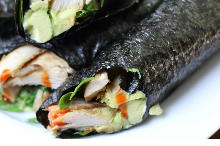 - Læg et par skiver avocado langs en kort kant af nori-indpakningen, ¼ kop strimlet kylling, smuldret bacon, lidt rucola, en smule varm sauce og en drys hakkede forårsløg og koriander.