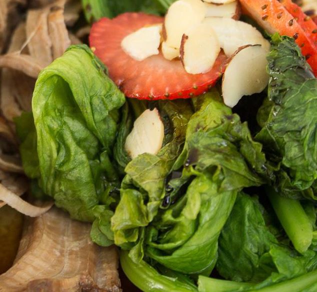3. Tilsæt mandelflager, skivede jordbær og fetaost til salaten.