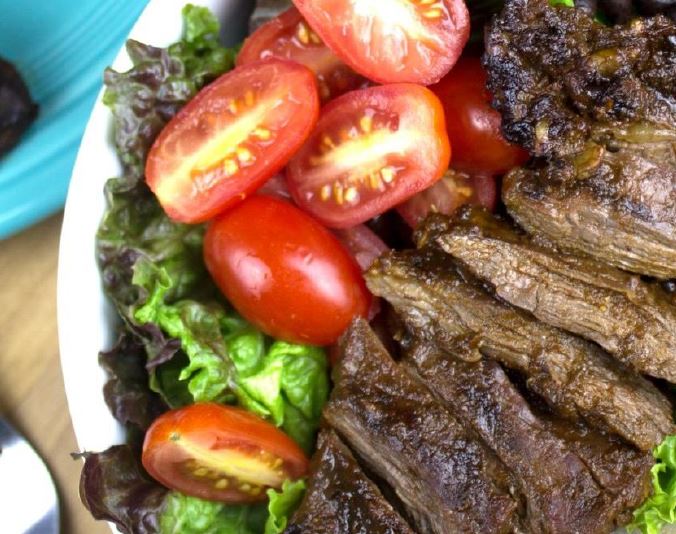 - Sæt hakket bladsalat til serveringsskåle, og top med cherrytomater, sorte bønner, tynd skiver løg, skivet bøf, guacamole og salsa (resterende marinade).