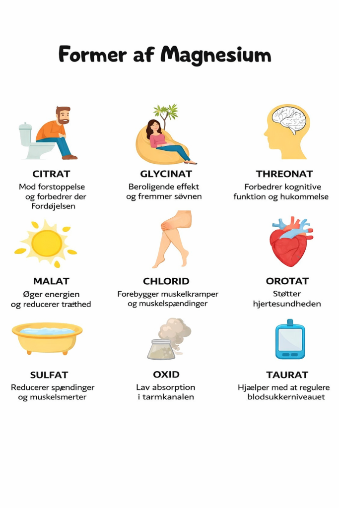 Magnesium er et vigtigt mineral, der spiller en rolle i over 300 enzymatiske reaktioner i kroppen. Det findes i mange former, og hver form har sine egne specifikke fordele og anvendelser. Her er en oversigt over nogle af de mest almindelige typer magnesium: