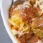 Tilsæt spaghetti squash strenge til 9x13 bagepladen, tilsæt kødboller og hæld marinara sauce over kødboller. Dæk med folie og bag i 10 minutter.
