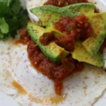 Tilsæt et ske med salsa oven på æg, tilsæt skiver avocado og pynt med frisk koriander.