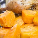 Skær kylling og server med velsmagende søde kartofler. Drys alt sammen med juice fra panden.