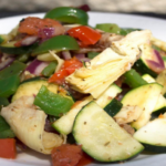 Tern zucchinis, peberfrugter, løg, tomater og artiskokhjerter i store stykker.