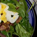 Læg spinat i en stor salatskål. Skær æg i skiver og tilsæt, læg til side.