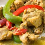 I den anden stegepande, tilsæt kyllinger og paprika skiver, og kog, indtil kyllingen er færdig, ca. 10-12 minutter.