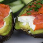 Fyld hver avokadohalvdel med smuldret gedost, hvis du bruger det, og top med en skive røget laks.